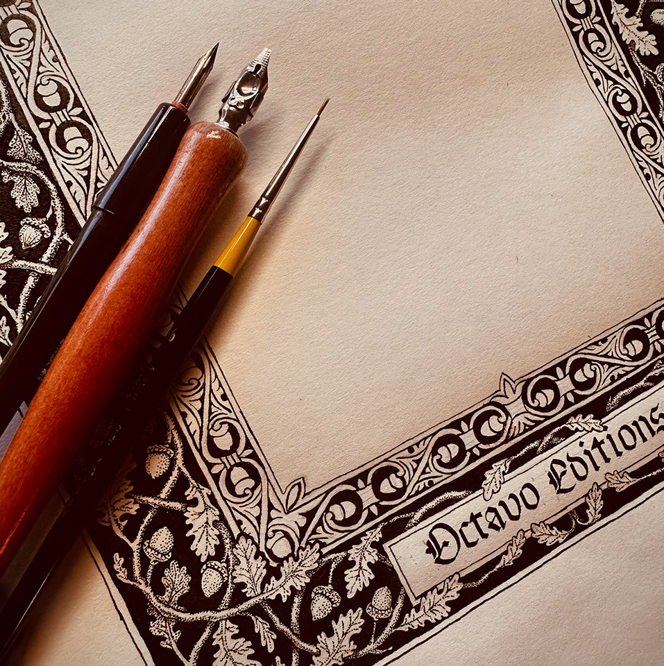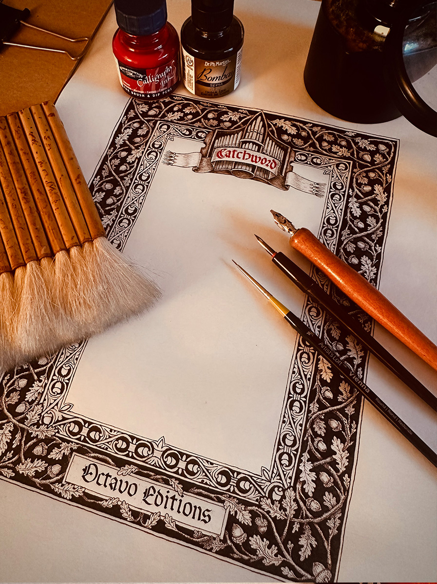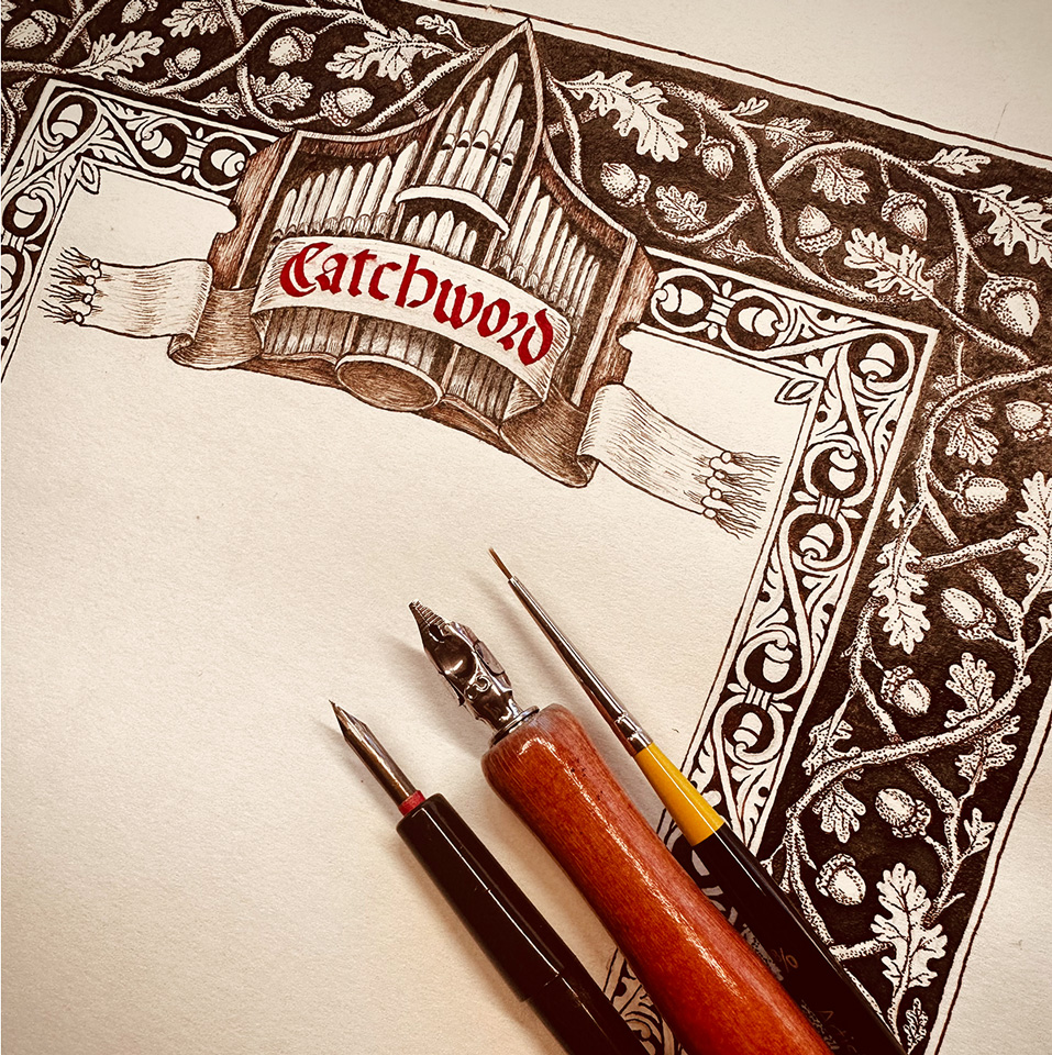 After several boarder pattern studies, we landed on the oak leaf. I really wanted to do two boarder patterns with one insetting the other, so I chose acorns as the inner pattern taken from and old tin etching while designing the outer oak leaf branches on the outside. Crowning the piece is an illustration of a pipe organ the Octavo Edition was intended for.