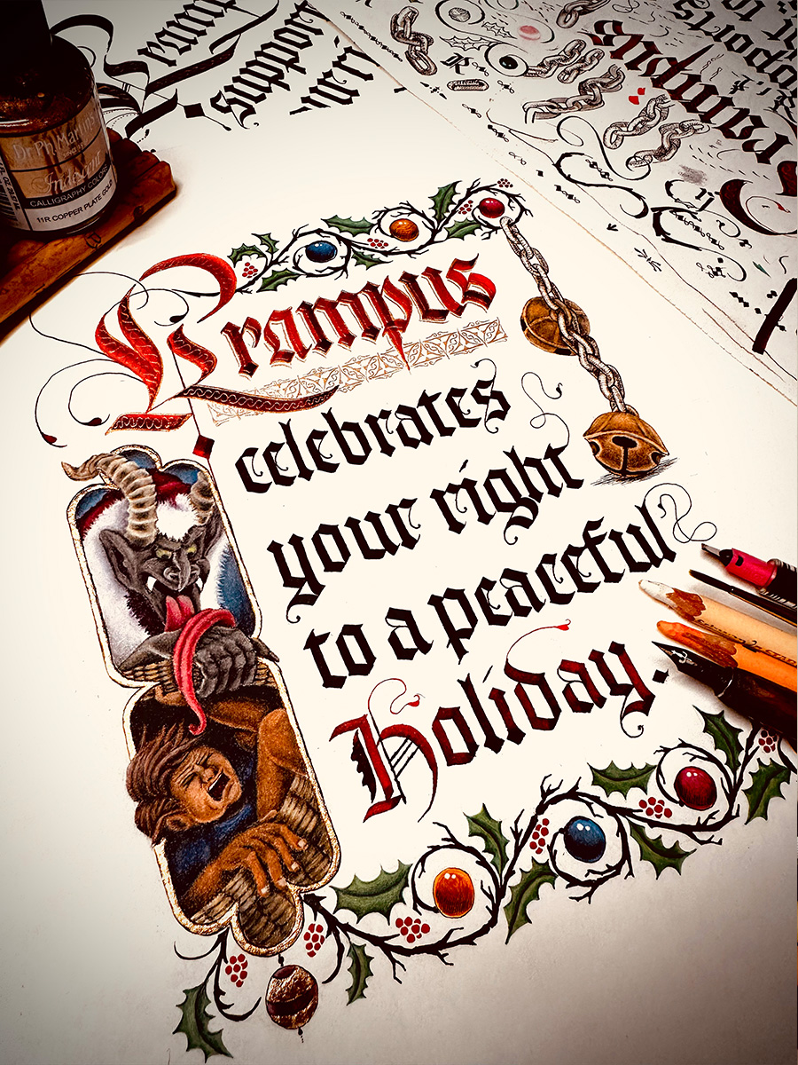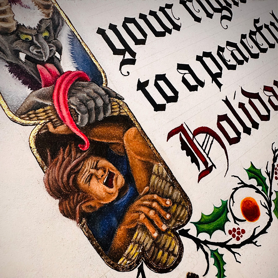 This twisted thought had been brewing a few seasons. A happy holiday wish from Krampus, the Kringle of Penance, to anyone desiring peace and quite for their winter season. 5″x7″ holiday cards.