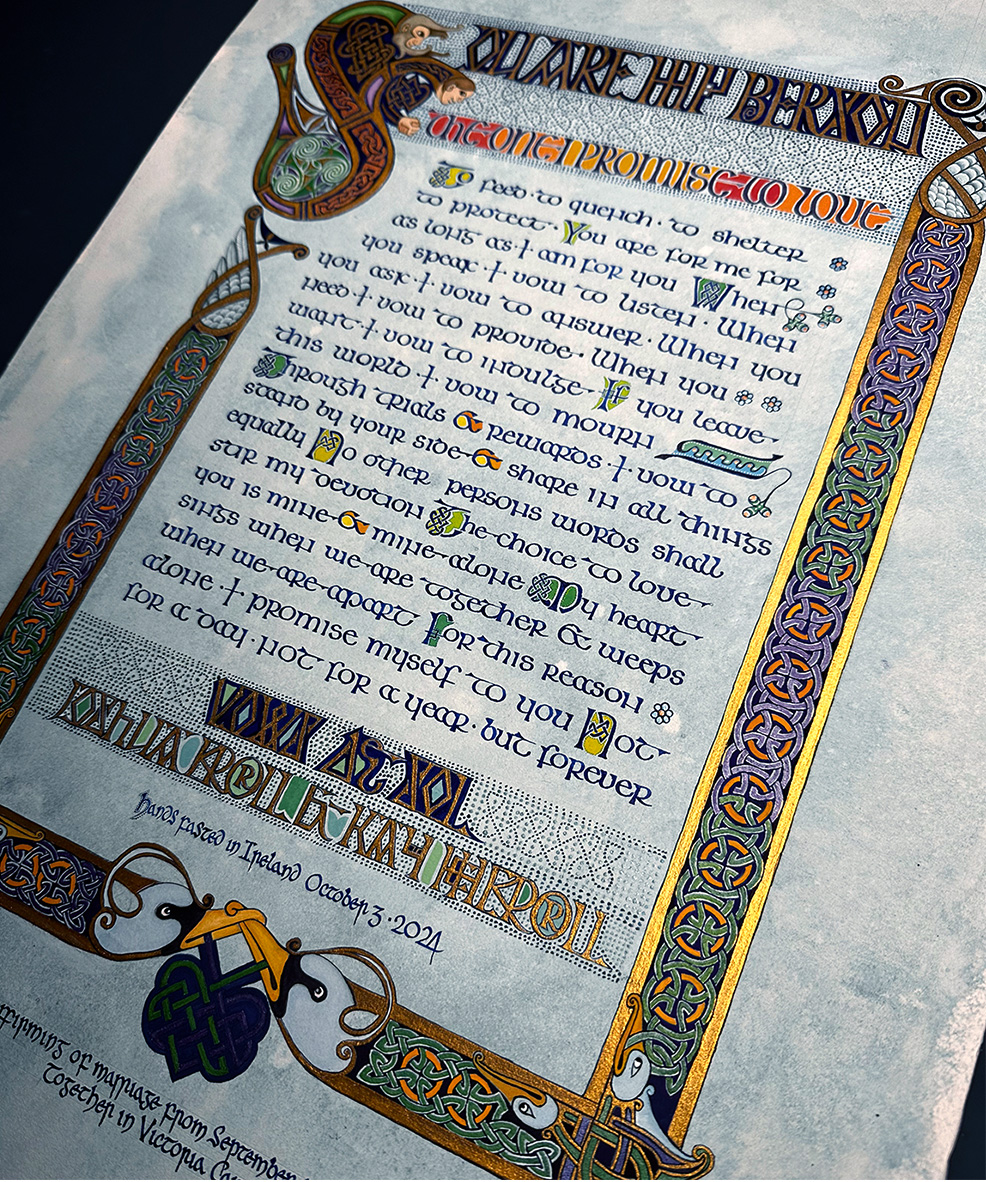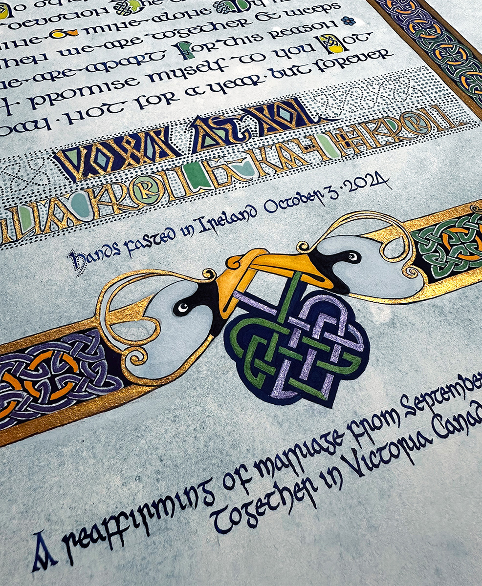 How can anyone properly immortalize words they live by. Say them once, write them down, and tuck them away only to revisit them once a year? OR, do as this Irish born Canadian husband decided to do – create a manuscript to honor their heritage, hands-fasting ceremony, and the sacredness of the vows they’d reaffirmed on that fateful October day.