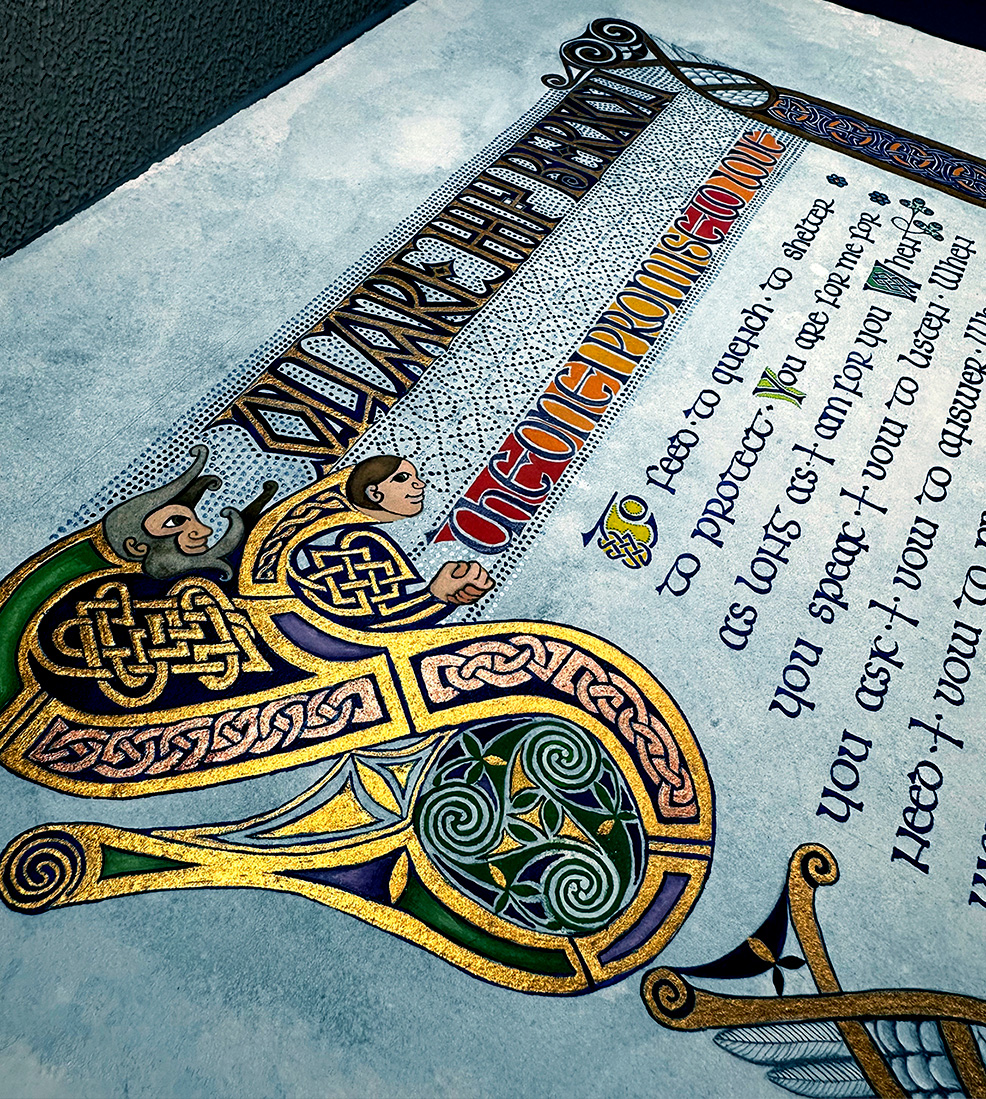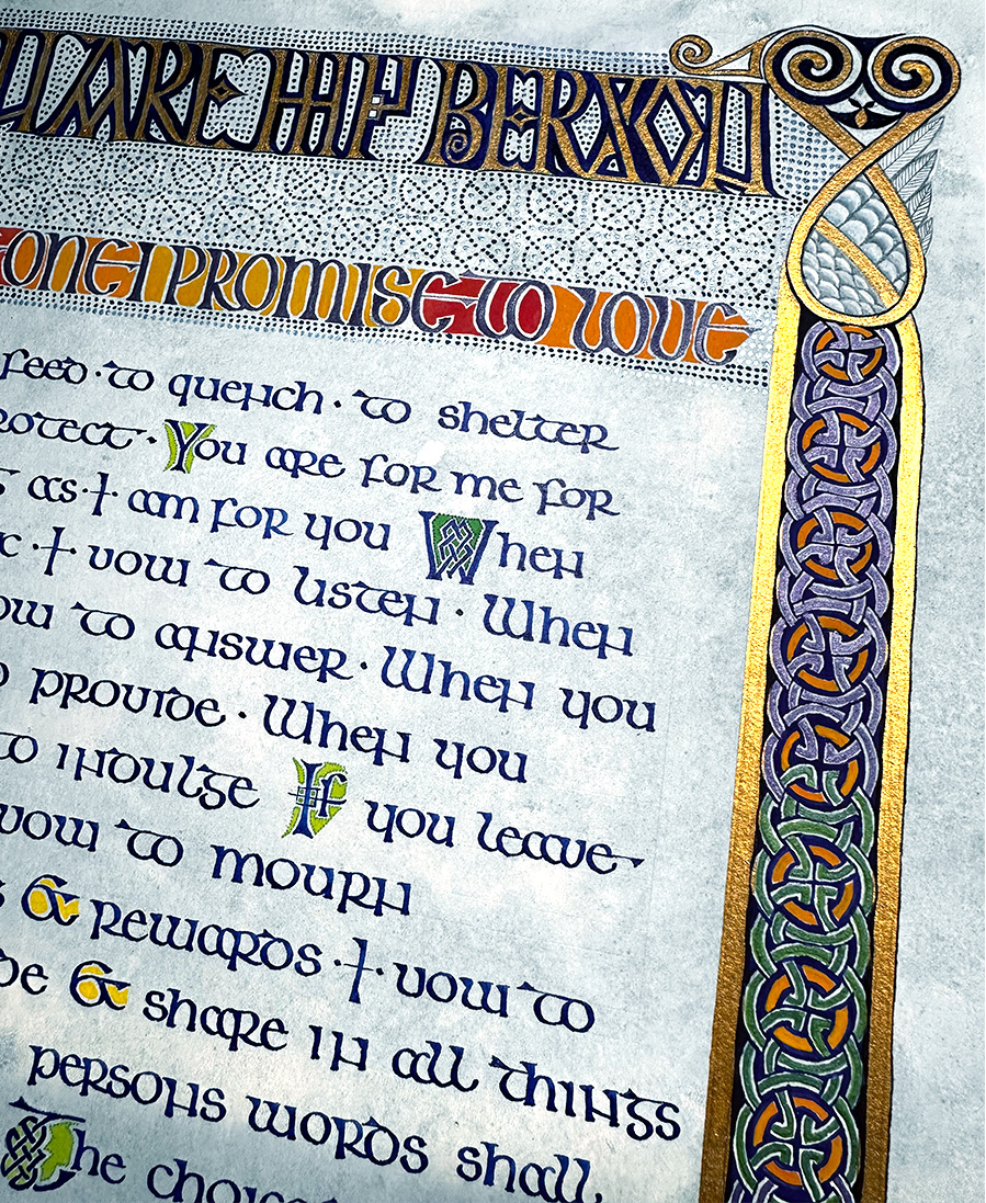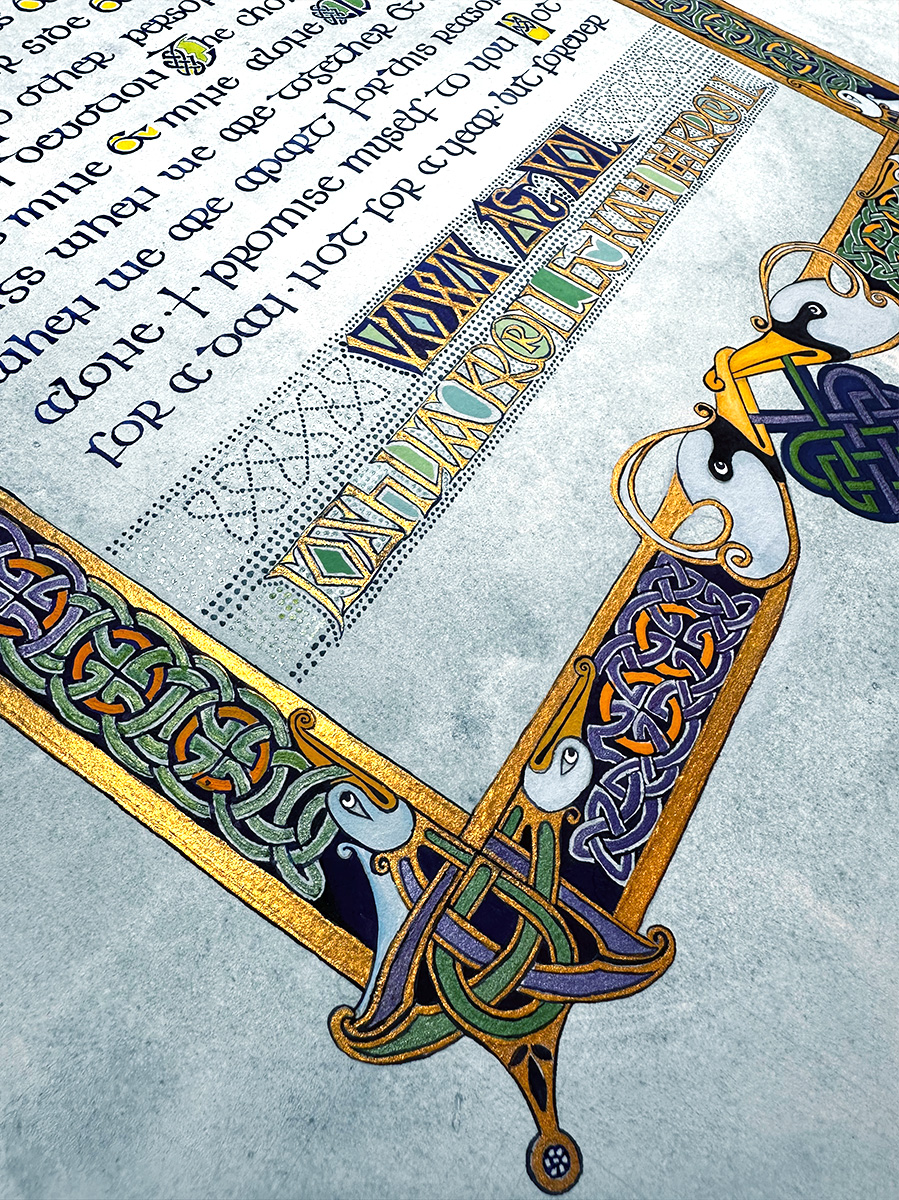 I felt the nature of this piece needed to honor as much as possible the traditional Celtic manuscripts with not only motif’s but letterforms as well. So, each character was rendered in hands found within the three manuscripts. The illuminated ‘Y’ caps depicted both male and female heads of the couple, intertwining the males arms in knotted hearts, and around the female terminating into folded hands. Swan heads crowned the foot of the piece with each hand fasting ribbon held in their beaks and knotting together into hearts. Swan wings frame the text on either side with intricate boarder knotwork which nested gold rings throughout. Margin notes were added thereafter detailing the dates and locations of the couples ceremonies.